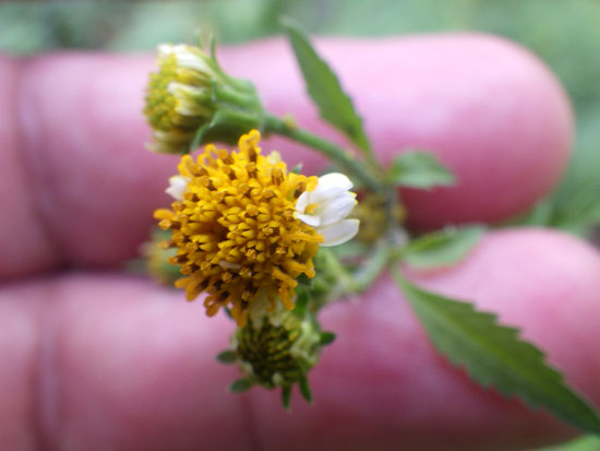 アレチヌスビトハギ同様、このセンダングサも衣服に冠毛がついてやっかいないわゆる「くっつき虫」です。センダングサにも多くの種類がありますが、白い花びらのようなもの(筒状花)が出てきているので、アイノコセンダングサと判別しました。