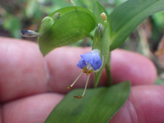 ツユクサのつぼみは袋のようなもの「苞(ほう)」で保護され、開花のときに出てきます。画像はちょうど出てきたところ、あとは青い花びらのような内花被が開きます。なんだか出産を見ているようです。